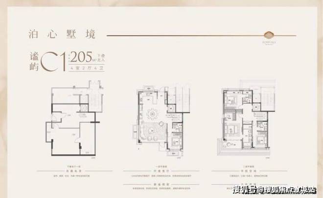 户型特点:下叠边套,南向面宽约9米,客餐厅同宽约5.8米,空间开阔。一楼设南向卧室,采光好且视野佳。二楼为三套房+主卧总统套房设计,主卫南向,可容纳浴缸和双台盆。地下室方正,附赠采光井,利用率高。