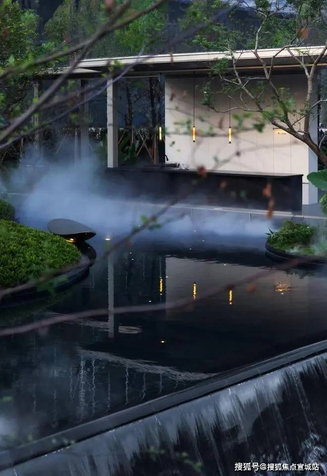 震撼瀑布水幕自建筑二层倾泄而下,伴随着轰鸣的水声与飘渺的水雾,自然而然的将建筑与园林融为一体,空灵之境悦然于心。