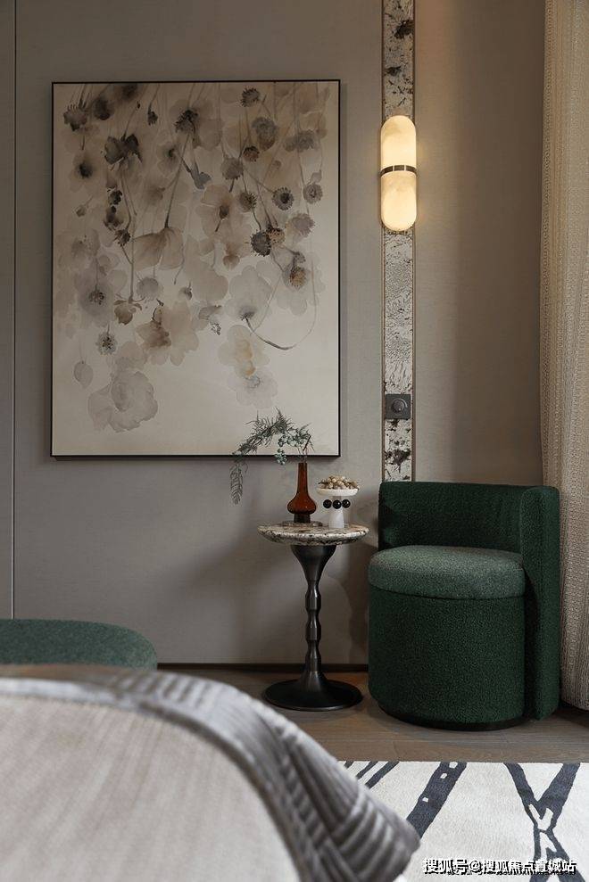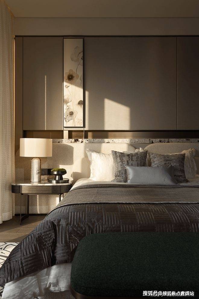 苏州湖城风华售楼处电话☎:400-8828-814(售楼处预约看房热线)浅色系的床品与空间极致融合,木饰面搭配雪山兰奢石以深浅的明暗色调平衡臥房內的溫度,形成奢适与静雅的平衡,赋予空间深沉内敛的韵味,不失奢华。