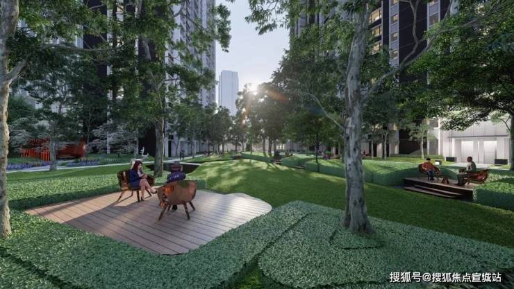 在活动大草坪上互动,其中有专属儿童乐园,景观中还保留了一些休闲平台和户外凉亭可供家长看护孩子,打造住宅花园城市中的平静绿洲,塑造与大自然的互动体验。