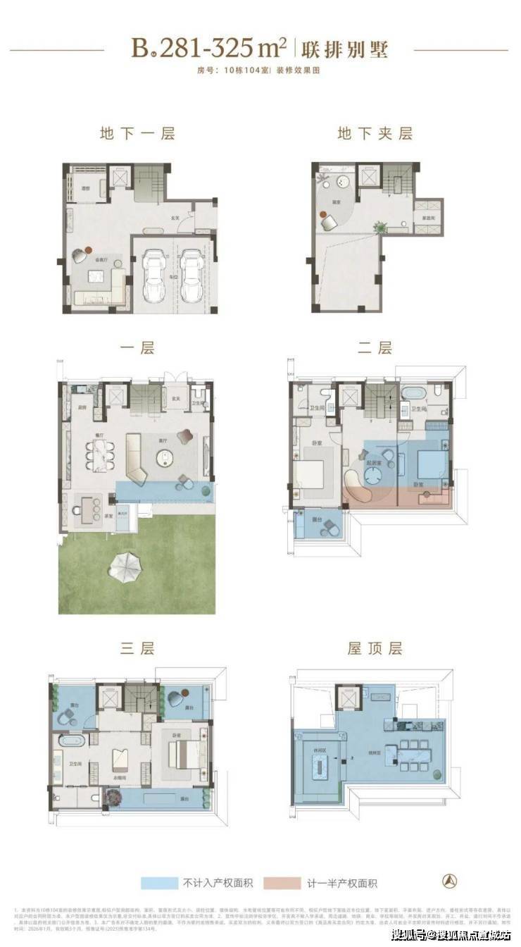 ● 首创“一墅六园”的空间规制,以约186%的超高实际使用率,为每位家族成员打造专属天地。(以B户型建面约281-325㎡展示样板10-104为例)
