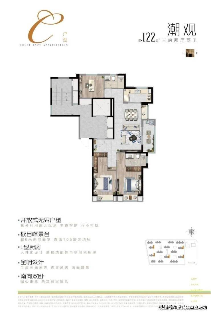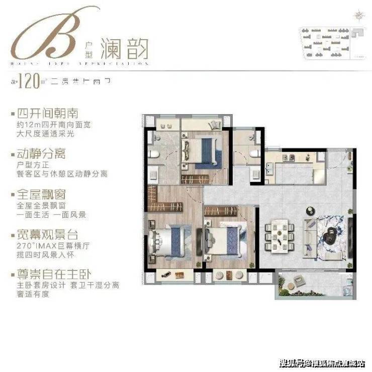 120平米双面宽版开放式交友户型,大尺寸景观阳台直面东侧地标,主客卧分开,保障隐私。