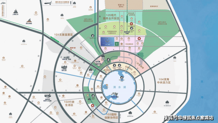 荣耀之环(在建中):临港新片区跨境金融总部集聚、金融业务创新区的总部湾核心地标,直径达150米的巨构圆环,漂浮在临湖的4栋百米塔楼之上,其圆形结构象征着金融的繁荣和统一。
