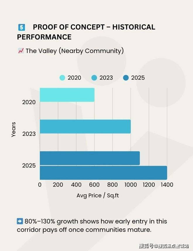 以周边社区The Valley为例,2020-2025年该社区每平方英尺均价实现80%-130%的涨幅,印证了提前布局该走廊的社区,在成熟后能获得可观回报。