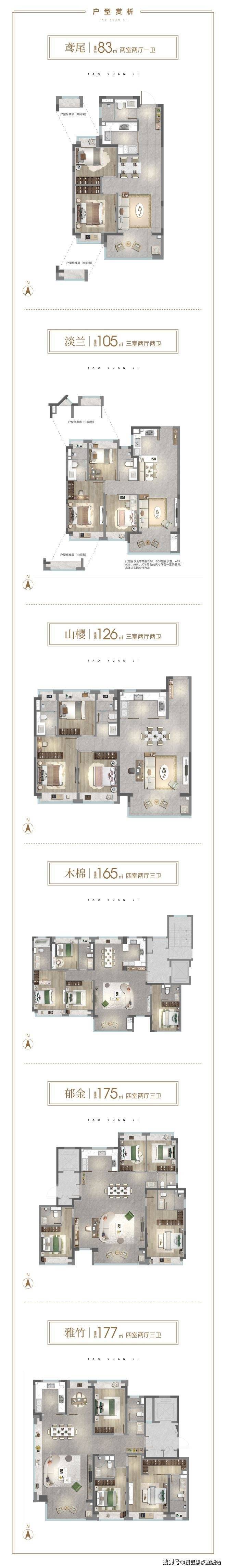 北地块436套,户型为:建筑面积约83㎡、105㎡、126㎡、175㎡、177㎡