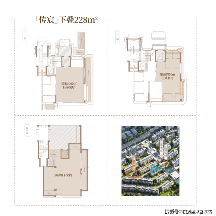 「传宸」下叠228㎡,拥享建面约110㎡南向花园(边厅)、建面约60㎡巨幕宽厅、建面约50㎡主卧套房以及建面超200㎡双层地下空间,一层一境,进阶三代阖居生活;