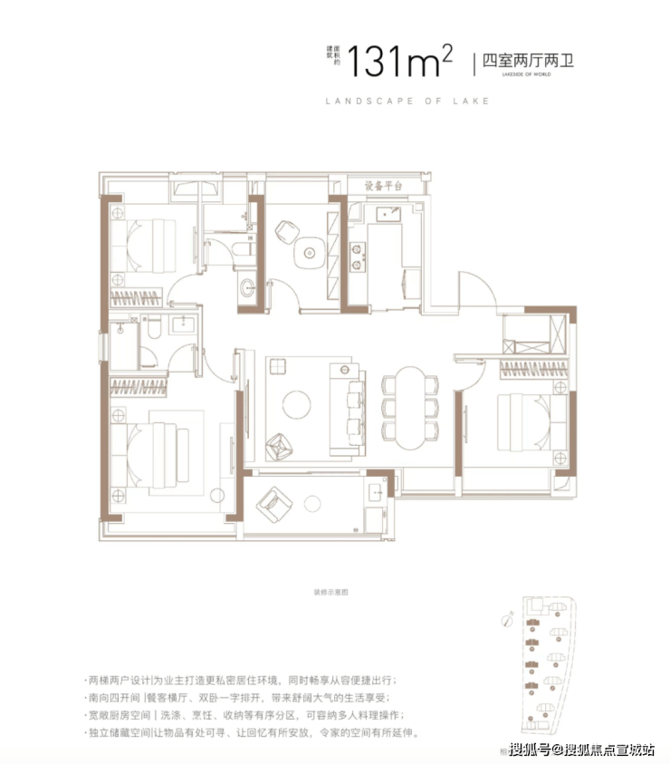 建筑面积约131㎡4房2厅2卫,做到了四开间朝南+南北通透+主卧套房设计+全卧室带飘窗+卫生间干湿分离,是一步到位的大4房户型。
