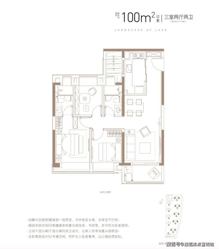 三开间朝南+主卧套房设计+动静分离+全卧室带飘窗,功能性和尺度感完美结合的3房,能满足业主从二人世界到三口之家,再到二胎家庭的全生命周期需求。