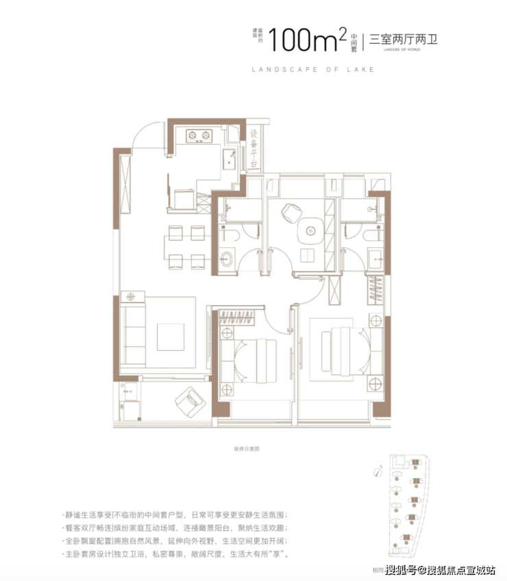 建筑面积约100㎡3房2厅2卫(中间套),全卧飘窗配置,延伸向外视野,拥抱自然风景。而大进深的阳台空间,除了可以满足基本的洗衣晾晒以外还可以日常养花喝茶,实现更多元的生活享受。