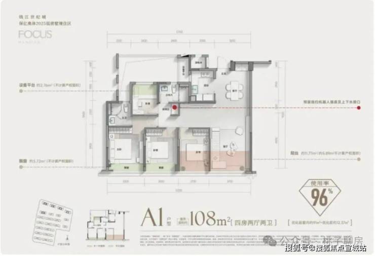 4房灵动布局(北面小房间面宽都有约2.4米),让建面约108㎡的户型,也可实现3.7米面宽开阔竖厅,让一个入门级小户型,也有约40㎡餐客厨空间。