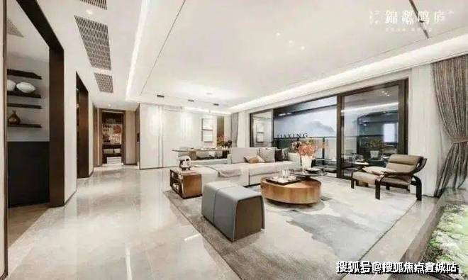洋房亦是现代中式风,大幅通透玻璃搭配香槟金铝板线条,顶部坡屋顶设计,每层之间,特用“金包玉”工艺,在香槟金铝板之间,嵌入白玉色铝板。层次感拉满,干净简约的感受扑面而来。