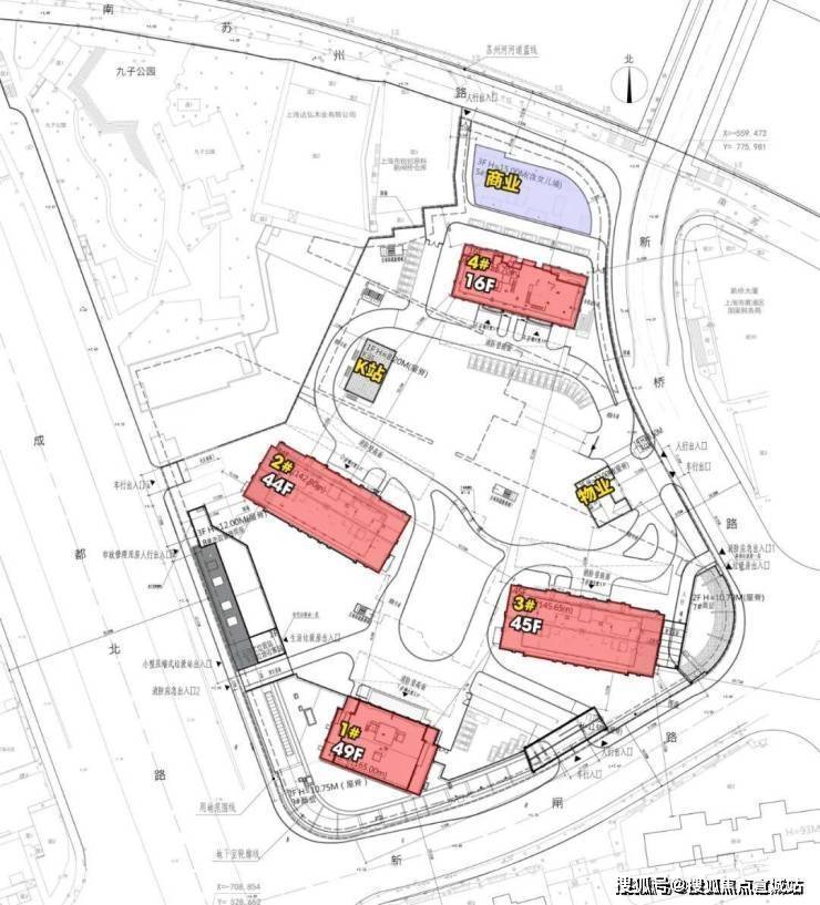 1#地块由四幢住宅组成,其中1幢住宅建筑高度能到165米,将超过浦西顶豪海泰北外滩和150米高的华侨城苏河湾双子塔。更是高于153米高的陆家嘴汤臣一品。其余2#和3#分别在142-145米左右,44-45层楼。4#则是16层高的住宅。
