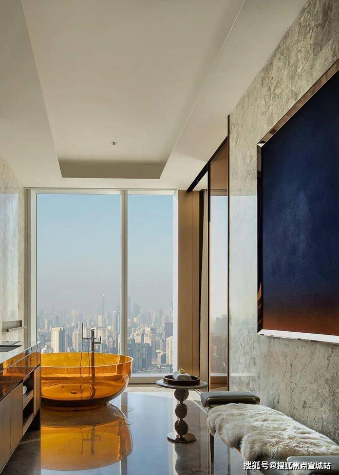 走道端处香槟色金属雕塑,形类城市高楼,又若恋人彼此依偎;全采光套房拥揽白日上海黄浦的忙碌、繁华,也收藏夜晚灯火阑珊的宁静、美好.
