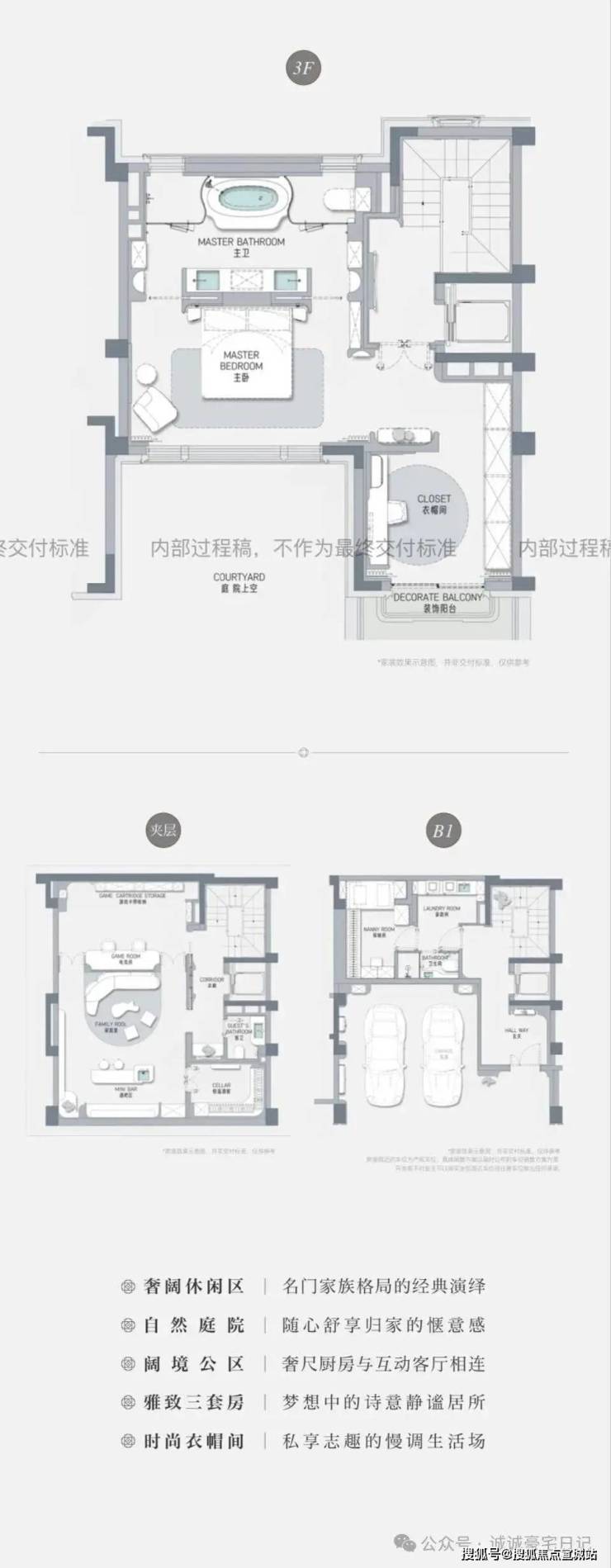 建面约 230-305㎡:独门独院,私家庭院(最大进深 8 米),顶层星空阁楼,地下双车位 + 藏品空间,适配多代同堂 / 高端社交