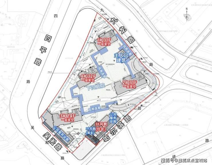 具体来看,1#总高31层,一层架空;2#总高31层,一层架空;4#总高32层,一层架空;3-1#总高24层,一层架空;6为风貌建筑,总高3层,含商业和住宅。在景观设计方面,小区内规划了景观架构、风雨连廊以及下沉式庭院。