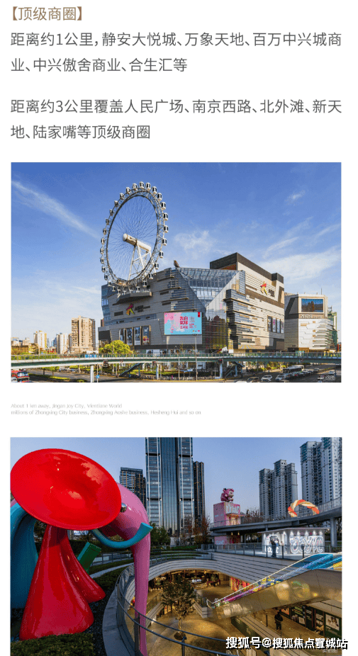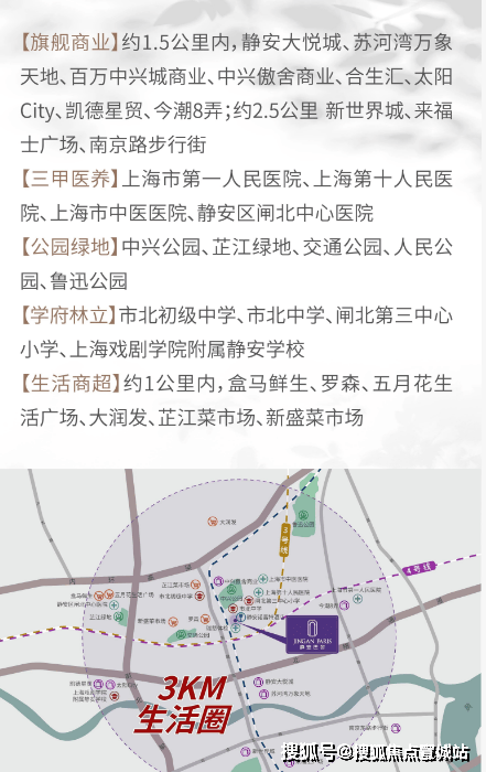 商业配套:1 公里范围内有静安大悦城、万象天地等商业综合体,1.8 公里到人民广场、南京西路商圈,自驾 15 分钟可到达静安寺、淮海路、陆家嘴等商圈。
