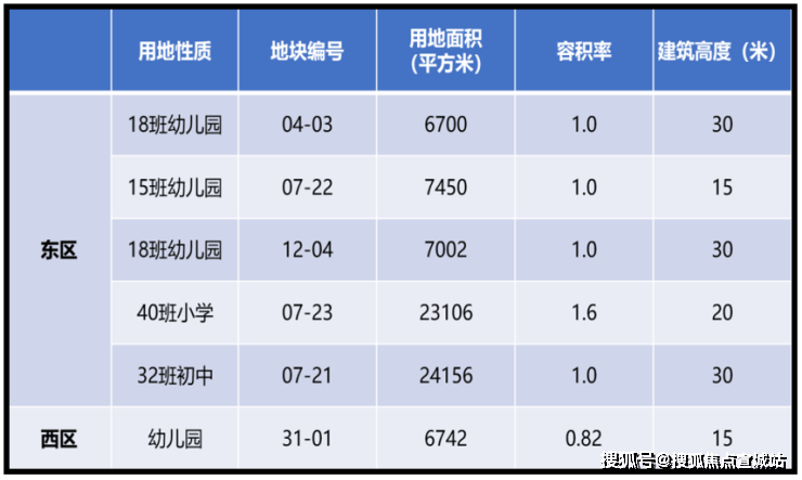 东区和西区最大的不同在于教育和公建设施配套,东区人口更密集,有5幅教育用地,从幼儿园至初中;而西区仅有1幅教育用地,作为幼儿园。