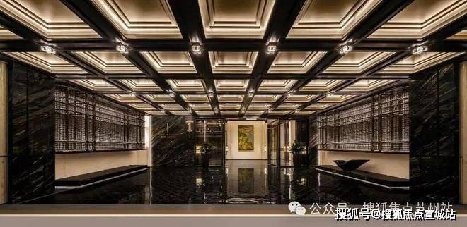 项目汲取伦敦安达仕酒店车马厅设计,地库整体重金铺装,墙面金属造型搭配南美洲苏里南黑石材,地面为精致石材拼花,融入苏州园林窗花元素。