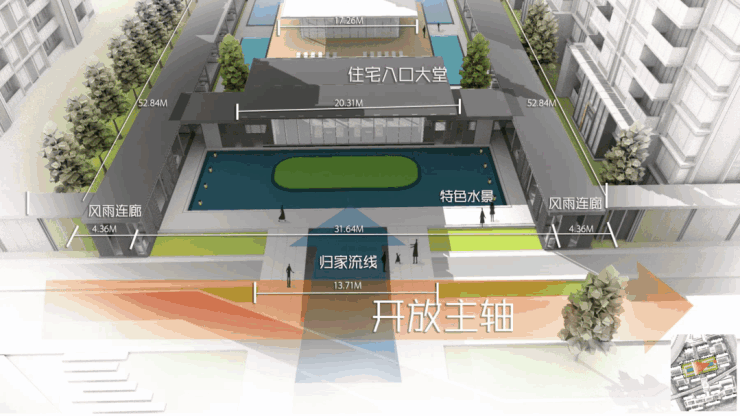 社区由自持住宅、可售住宅、社区配套三大功能组合而成,北区为公区自持配套区,中区为住宅社区,南区为住宅社区及配套。一条连续的公共通廊由海天湖公园引入社区,贯穿三大功能结构区。