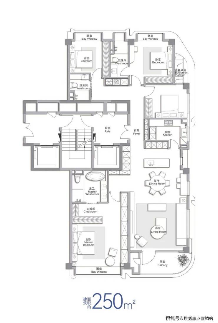 区别于市场常见的4房配置,项目做了差异化大三房,各空间更舒适。这造就了客厅及主卧超4米面宽。,放大社交空间尺度;同时客餐厨阳台一体化,厨房可开可合,下厨时也能和家人情感互动。约270°弧形观景阳台,给予居者宽广的视觉享受。值得点赞的是,双主卧尺度,北向大次卧和南向主卧几乎等面宽,既拥有领衔同级的大面宽,更赋予各家庭成员平权的尺度感。主卧L型衣帽间,增加收纳的同时避免了视线的直视。全卧飘窗设计,进一步增加了室内使用面积。在市中心地王频出,这是一个性价比颇高的好户型。