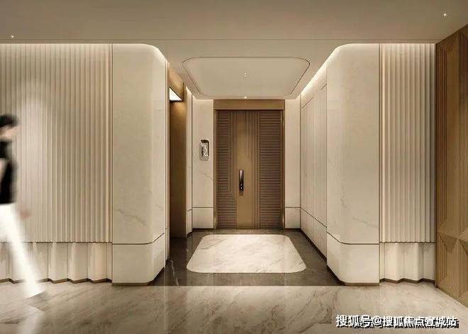 再看电梯厅,项目为2梯2户(准一梯一户)设计,相当于每户独用一部电梯,所以每个户型入户门口与电梯之间都有一块门前入户空间,大概是约6-7㎡,未来业主可以用作收纳空间,摆放鞋帽、外套等,非常人性化。