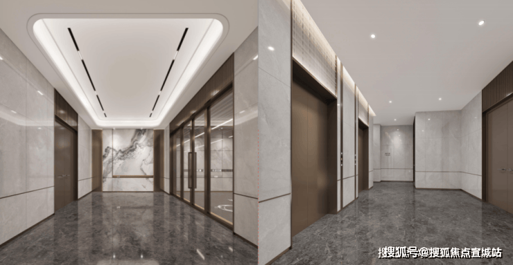 而地下车库归家,顶部灰色金属烤漆质感的格栅吊顶,配以灰色大理石瓷砖,在发光灯带的照射下,整体空间显得更加通透明亮。