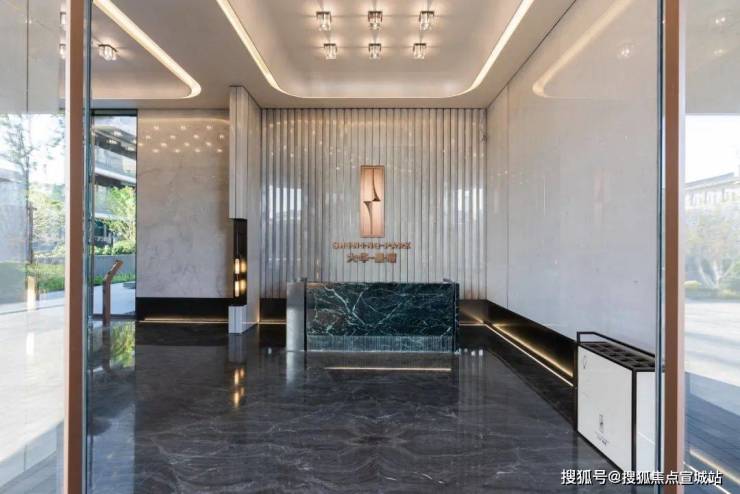 3、高端的爱马仕灰奢石打造的景墙,转角弧面犹如犹如翡翠赌石,优雅贵气。