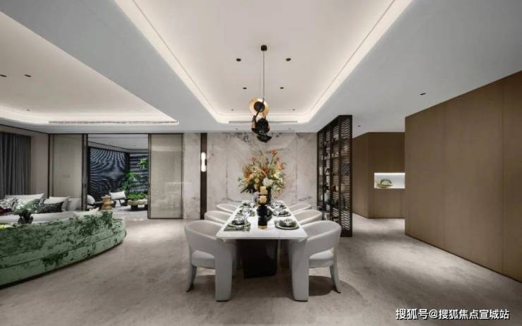 环幕三联厅的设计,让客厅、餐厅、多功能厅融为一体,承载多样的家庭场景。