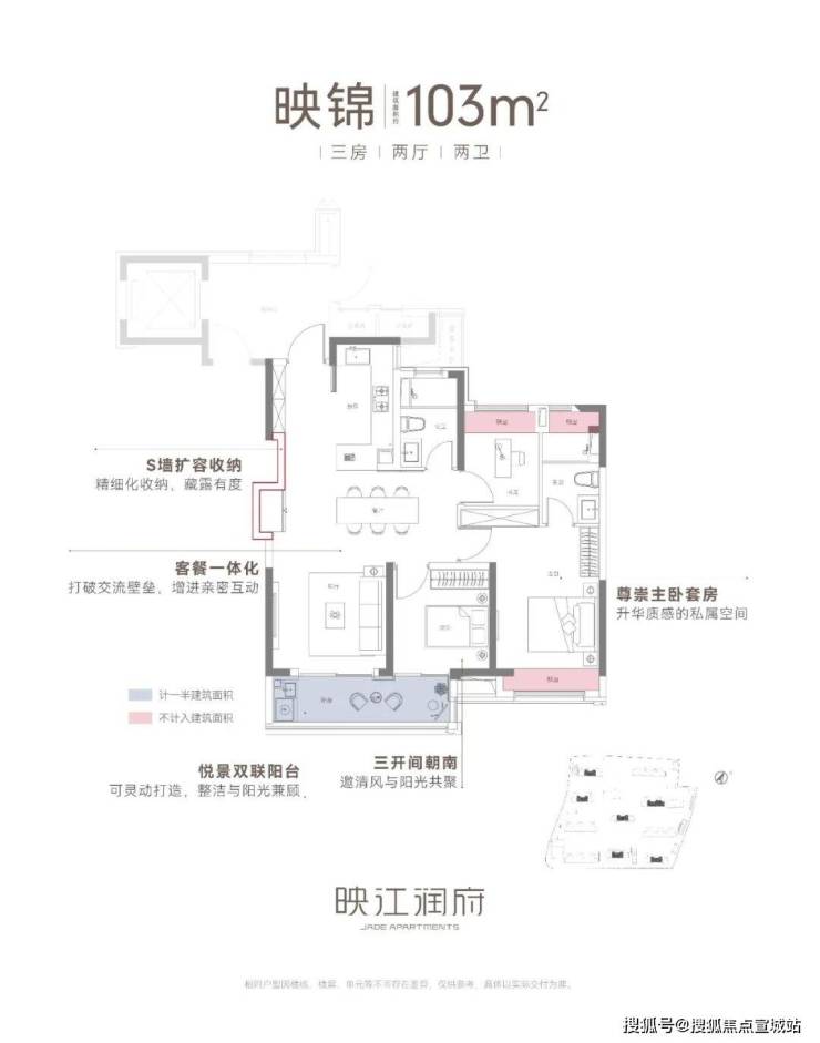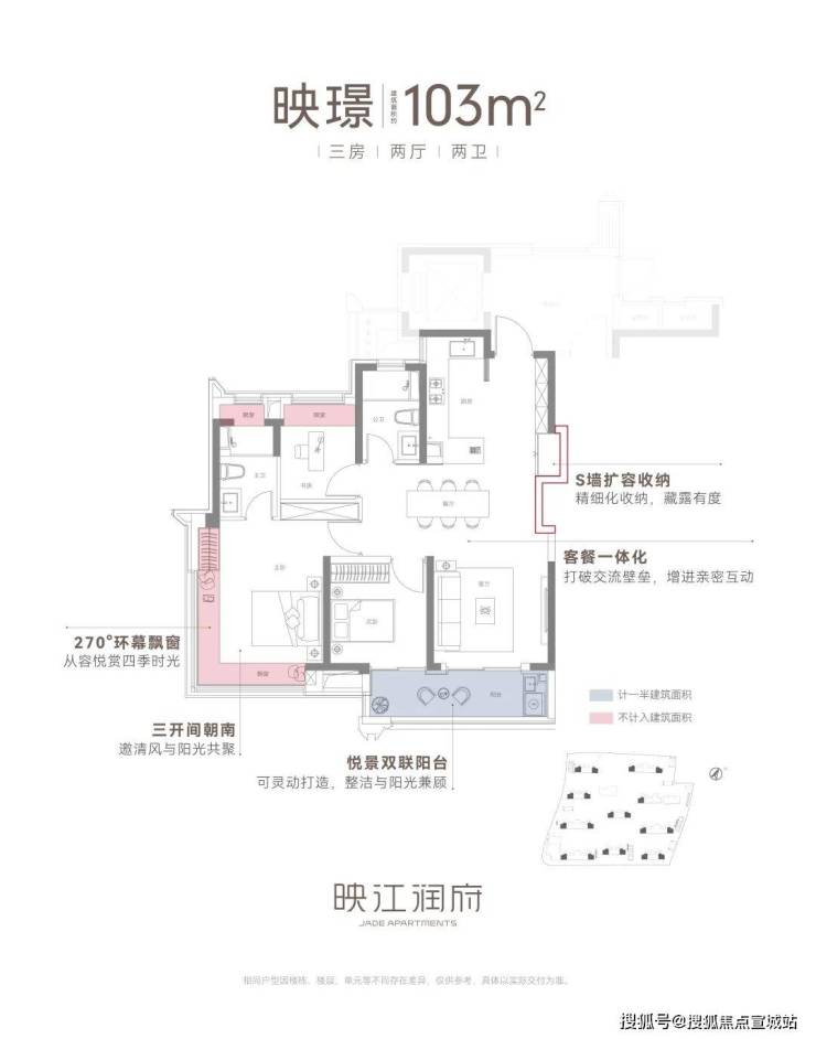 建筑面积约103㎡三房两厅两卫,不失为改善家庭的首选。其中边套户型,映江润府的主卧套房做了270°环幕飘窗,实现无与伦比的采光通风和视野享受,类比于千万级豪宅的体验!