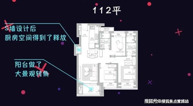 112平三房三开间朝南,进门后将过道改为餐厅空间,S墙设计后厨房空间也更大,阳台也做了大观景的转交,高区据说可以看到徐汇滨江。