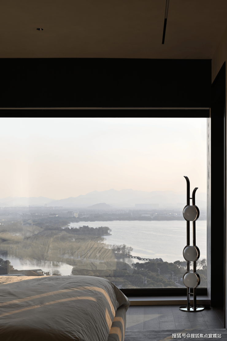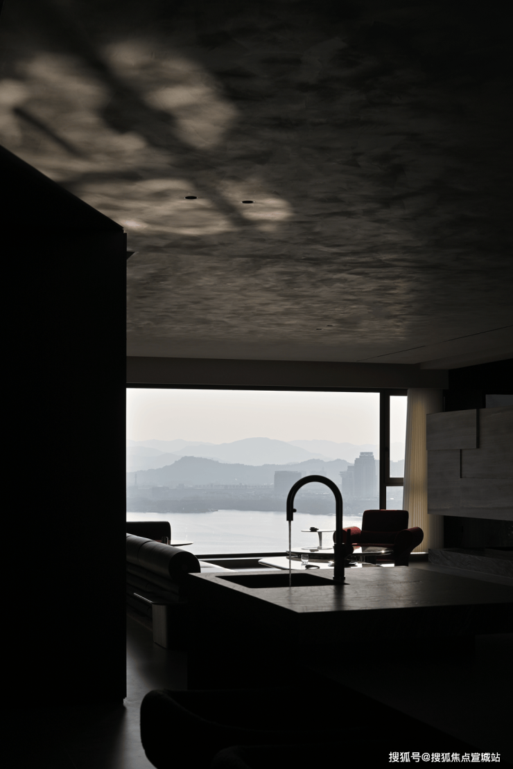 最大化的打开这层空间,让自然的气息流动,给光影轻灵穿梭的时机。从清晨,到日暮,水色韵韵,山色蔼蔼,光和影子从落地窗依依透入,时间就此慢了下来。
