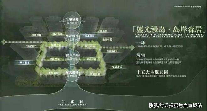 “山水聚场”理念,规划 “一环两轴十五园”景观布局,将水岸、岛屿、森林、花园、树屋作为园林节点,形成“行在景中、坐在岛中、游在林中、意在境中”的美学表达,营造出沉浸式山水活力场域。
