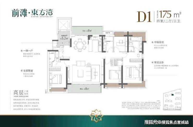 建筑规划:总占地面积约4.8万平方米,总建筑面积约15.6万平方米,容积率2.2,绿地率达36%,是前滩板块少见的低密住区。规划7幢17层高层住宅,总户数620户,车位配比1:1.8;外立面采用全铝板材质,标准层层高在3.1-3.15米,还规划了带恒温泳池的高端会所,健身会所配备LifeFitness力健高端健身器械,局部底层一楼做架空层并附带地下室。社区以“一轴两核多花园”打造景观体系,包含阳光草坪、健康跑道等功能空间,且实行全人车分流设计。