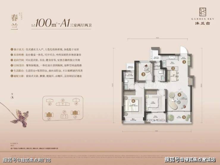100方户型三开间朝南,带阳台、飘窗,采光、视野都很不错。整体动静分区,互不干扰。