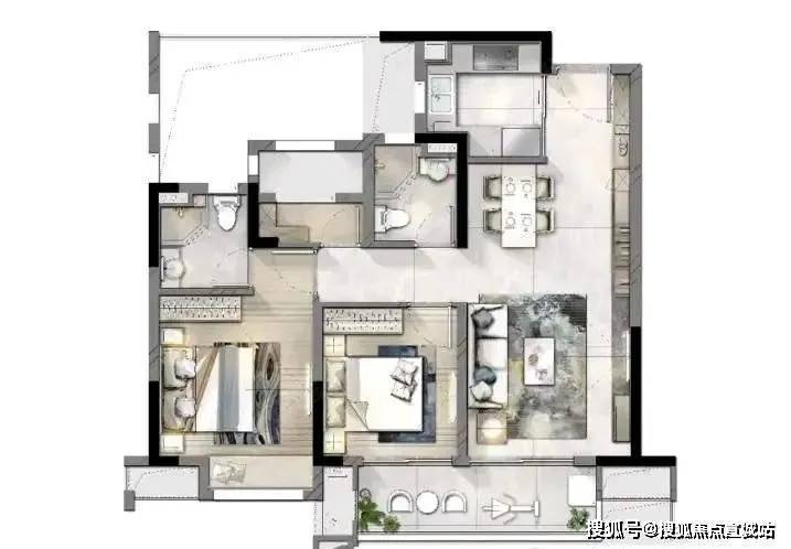 户型设计1条过道,过道面积紧凑,空间少不浪费。3室比较适合改善型人群,2卫的设计,解决了抢卫生间的尴尬,同时也保证主人生活私密性。户型的餐厅和客厅无缝连接,整体营造局部大空间的体验。房间动区简约大气,提供舒适生活娱乐氛围。主卧套房的设计,扩大卧室面积,提升主人居住体验,配有独立的主卧卫生间,增加私密性。该户型为动静分离设计,居住区域与娱乐区域完全分离,两者互不影响。卧室与卫生间相连,主人平日起居生活效率更高,提高了居住体验。
