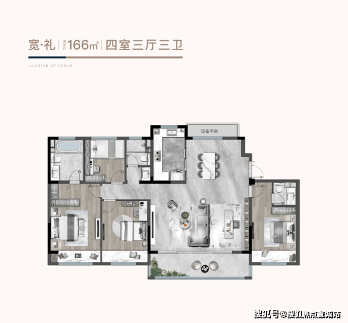 当人生攀登至理想高度,生活的宽度也需要契合匹配。熙和樾庭匠筑建筑面积约166㎡四室三厅三卫,以宽境敬献人生高度,犒赏人生大成。