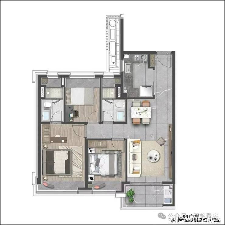 该户型贴合当代人居生活习惯,既适合三口之家小太阳家庭,也可以是三代同堂,每个人都能拥有独立空间。