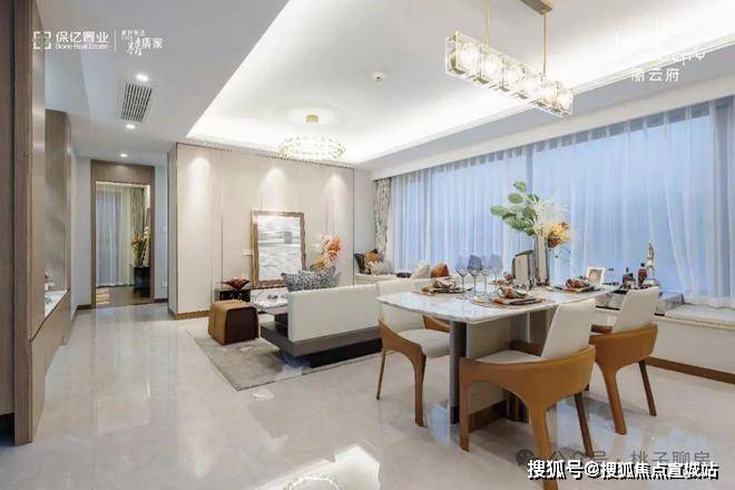 餐客厅一体,客厅与南次卧共享两面采光的双开大阳台,不仅公共区域空间更大气,而且日常晾晒很方便,景观视野更是广阔.