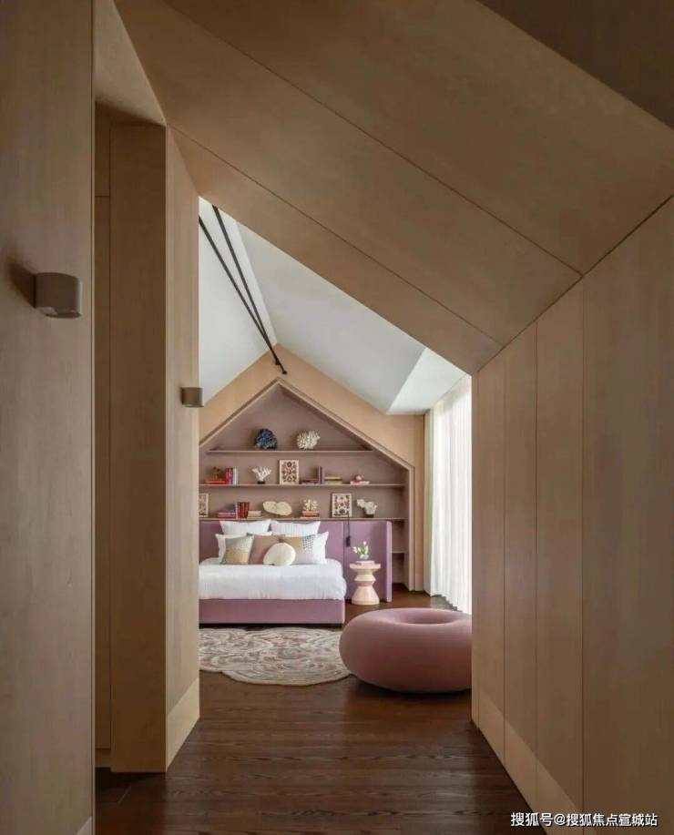 四层阁楼是大女儿的卧室。这里的斜顶启发我们在空间内打造了一个木质小屋;配备私人浴室和衣帽间,还有一个露天阳台,仿佛这充满阳光的一层就是个独立公寓。