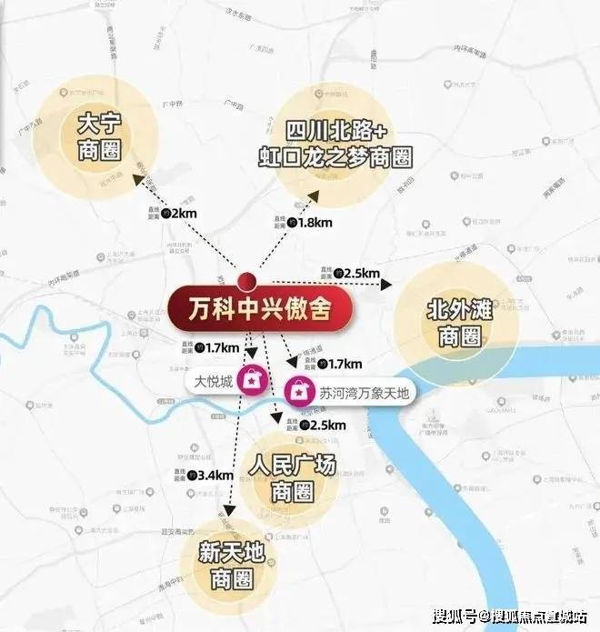 相较于虹口、杨浦,中興傲舍占据天然地理优势,以项目为中心直线距离约3公里范围内,南京西路、人民广场、外滩、外白渡桥、陆家嘴等城市地标星罗棋布。