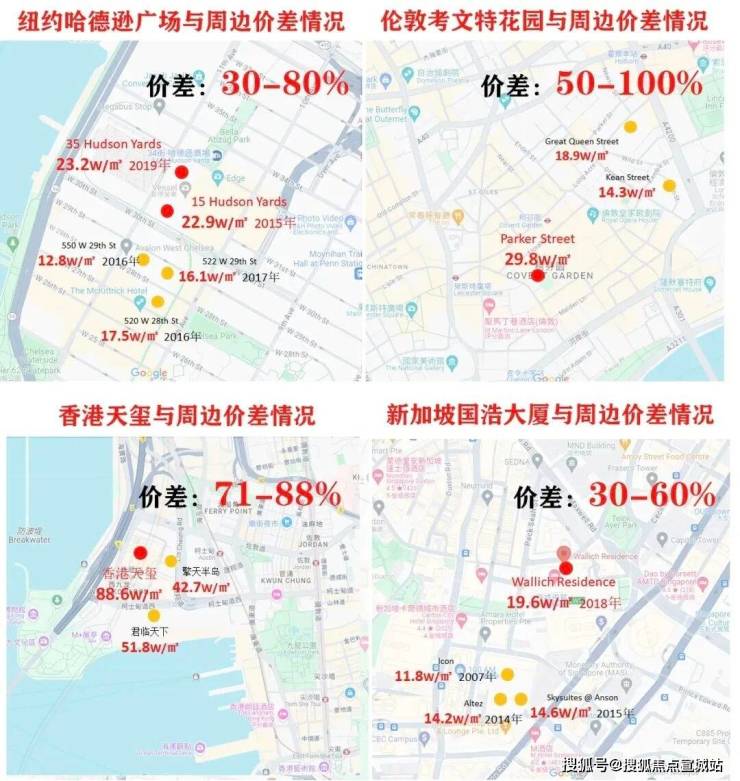 我们来看几个享誉全球的成功案例,纽约哈德逊广场,伦敦考文特花园,新加坡国浩大厦,香港天玺,这些顶级公寓都有一些共性点: