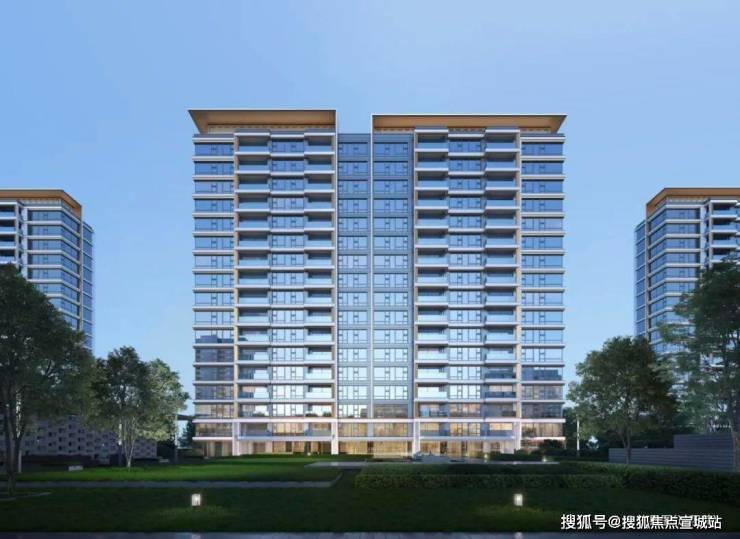 外立面的高窗墙比也是拉满,让整个建筑更具有通透性,带来超宽屏的视觉冲击;值得一提的是,阳台及主体窗的外轮廓还采用了34°斜切角处理,浅米色及暗金色铝板组合成艺术范“镜框”,与蓝灰色玻璃形成虚实对比。
