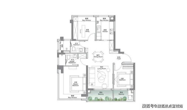 这个户型除了三开间朝南,再加上“3个飘窗+双面阳台系统”,采光通透性非常高优势之外,业主还可根据家庭结构与生活需求,灵活将空间定制为3房或者2+1房。
