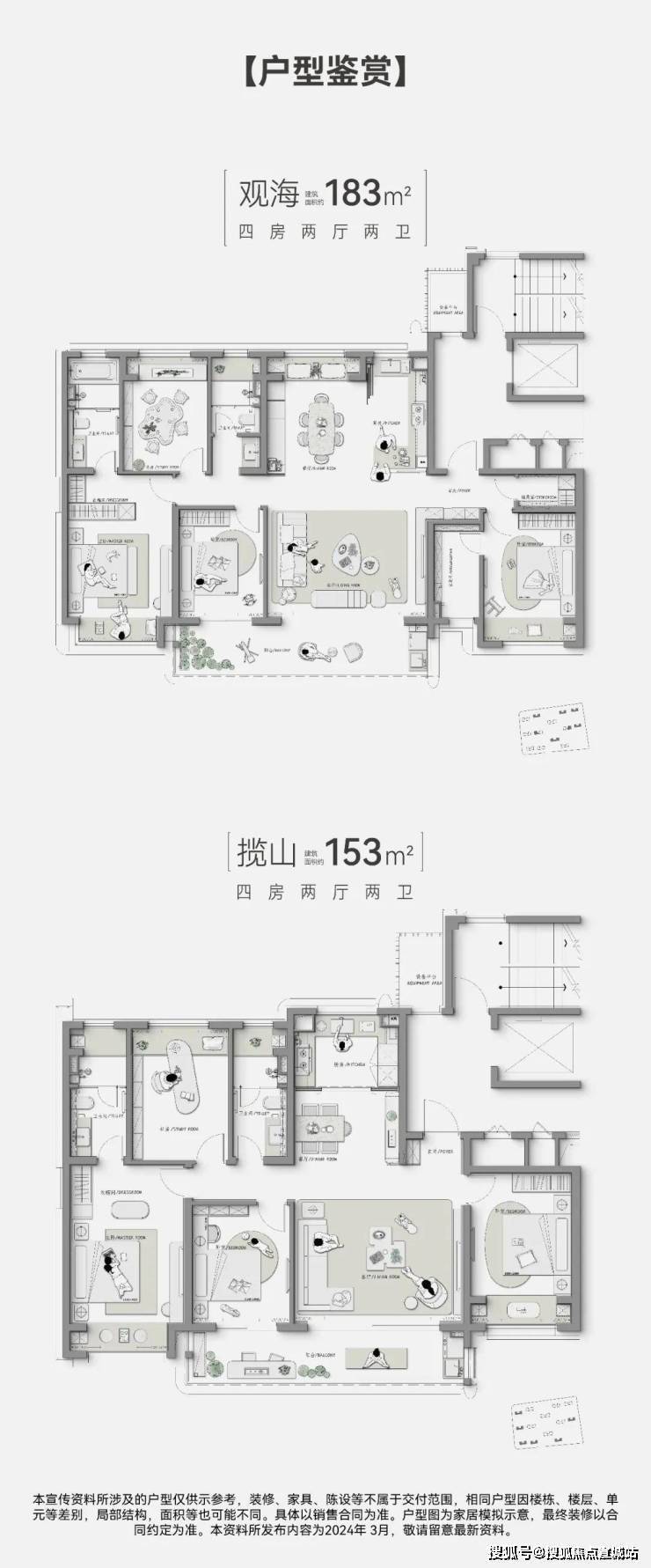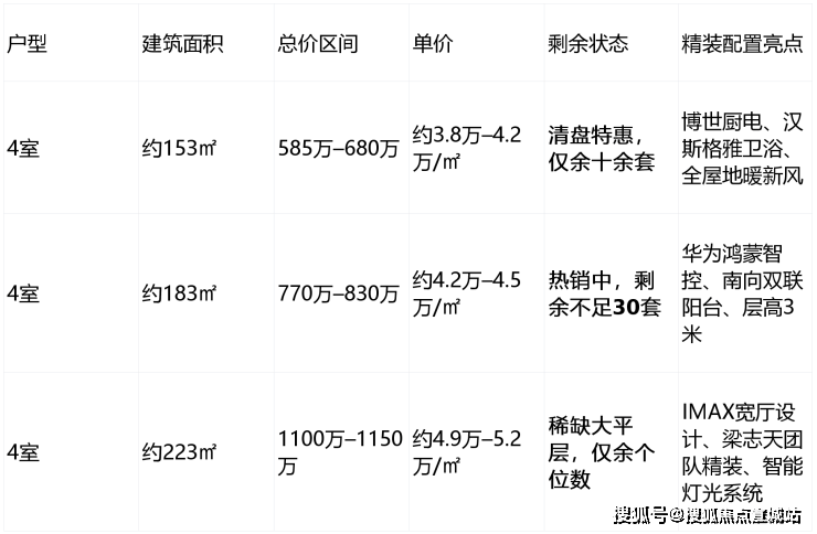 户型信息:主力户型为 153㎡、183㎡、223㎡的 4 房 2 厅 2 卫大平层,所有户型均为全明卫设计,且配置了南向三面采光大阳台,每个功能间都自带阳台、飘窗等外延空间。