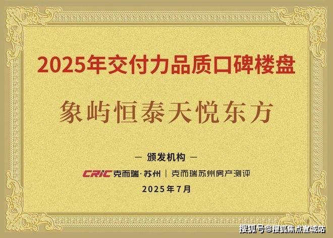 近日,天悦东方以卓越的产品力、高标准的交付兑现力、高满意度的交付口碑斩获由克而瑞·苏州|克而瑞苏州房产测评颁发的“2025年交付力品质口碑楼盘”。荣耀加冕,不仅彰显了象屿地产&苏州恒泰双国匠践行“好房子”国家战略,共创美好生活的责任担当,更是对天悦东方项目取得高品质交付的市场认可,以品质交付兑现金鸡湖畔的理想生活。