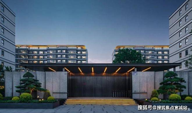 拾阶而上,苍松迎客,中轴对称挑檐新中式门头屹立,归家第一眼即惊艳。