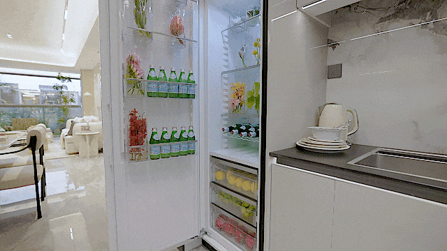 当然,项目延续了以往玖系产品里备受认可的交付标准,并优化了功能不足的问题。比如厨房冰箱,依旧甄选专业性能强的美诺独立双冰箱,即使是小户型的冰箱也是独立的两台,在保证选品的前提下,更合理地利用了室内空间。