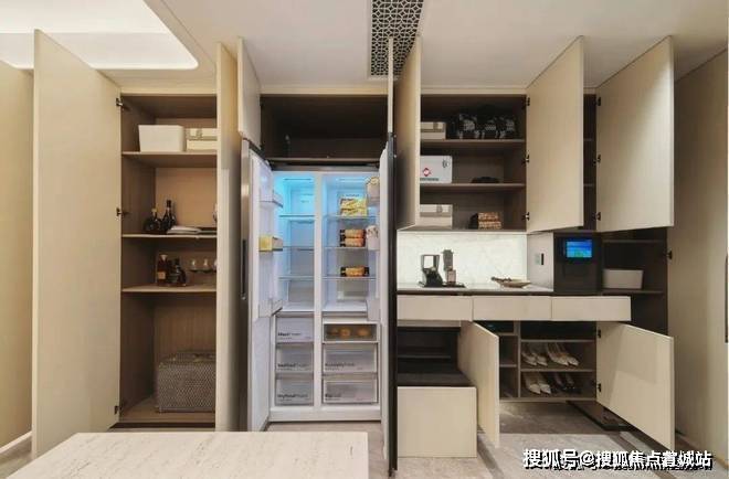 “冰箱外移"增加厨房操作台面和收纳空间,创造更合理的餐厨桌台动线。
