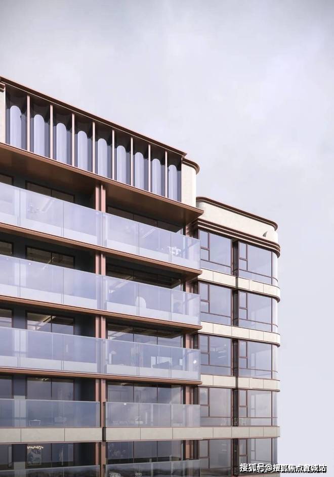 高层立面建筑的色彩以浅色作为主基调,采用石材与局部的涂料工艺,大量的落地玻璃之间,镶嵌了古铜色的金属板材,与风貌建筑的色彩形成呼应。