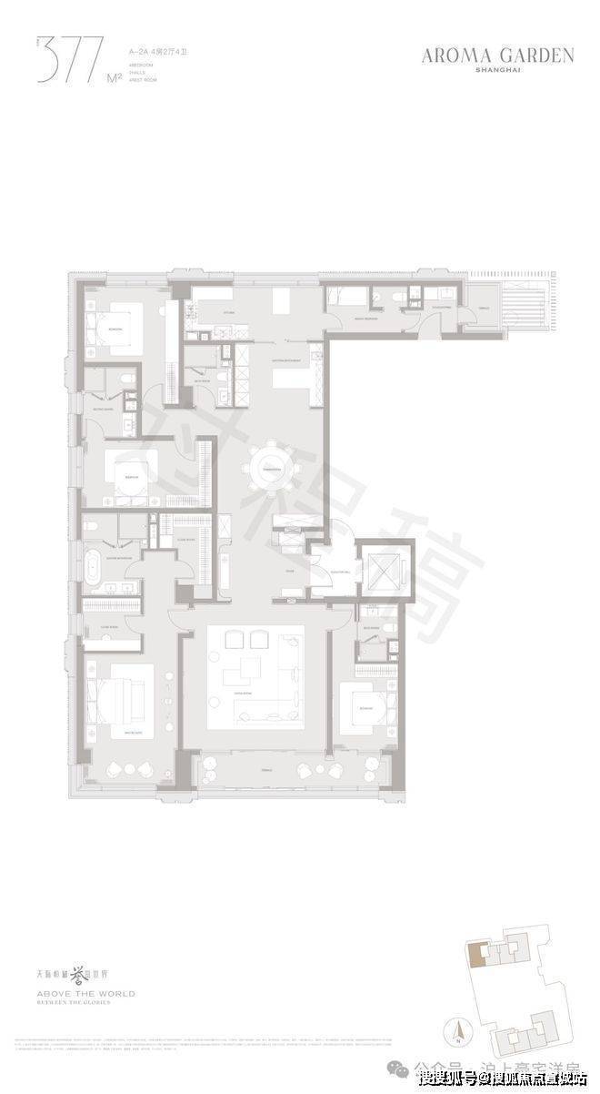 高层户型规划主力面积在260-882㎡区间。豪华主卧套房设计(部分户型为全套房设计),逾百平方客餐厅一体+270度转角落地窗+超宽尺度花园阳台,臻选智能化家居系统及世界顶级精装品牌,赋予居家艺术与智慧生活全新表达。